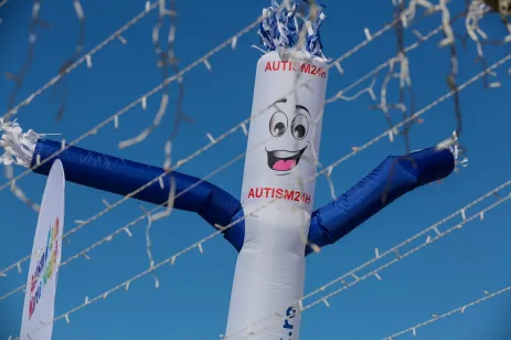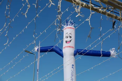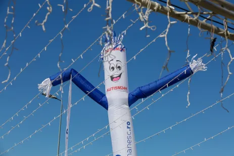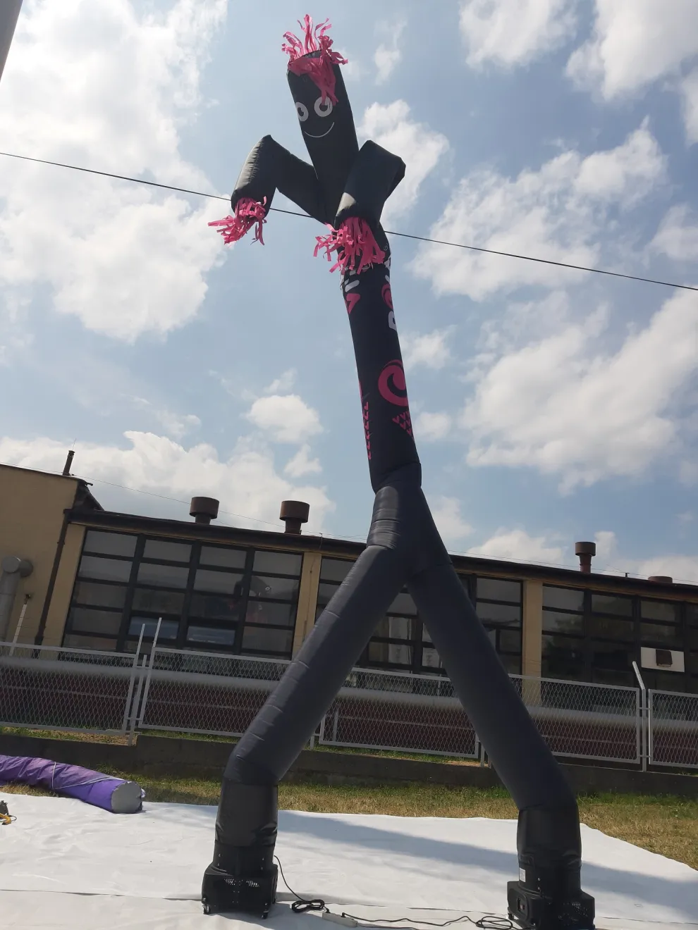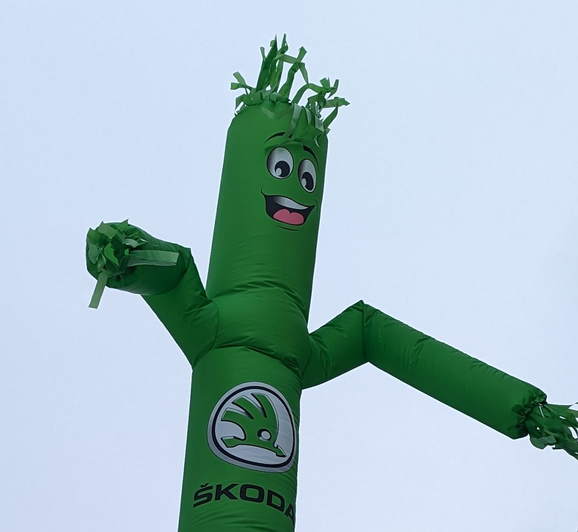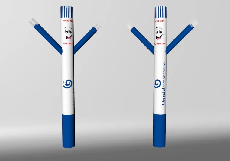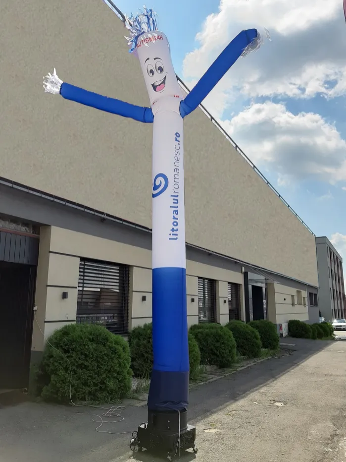 Skydancer personalizat publicitar. Datorită imprimării digitale, poate avea orice grafică dorită de client. Grafica se printează cu vizibilitate pe ambele fețe.