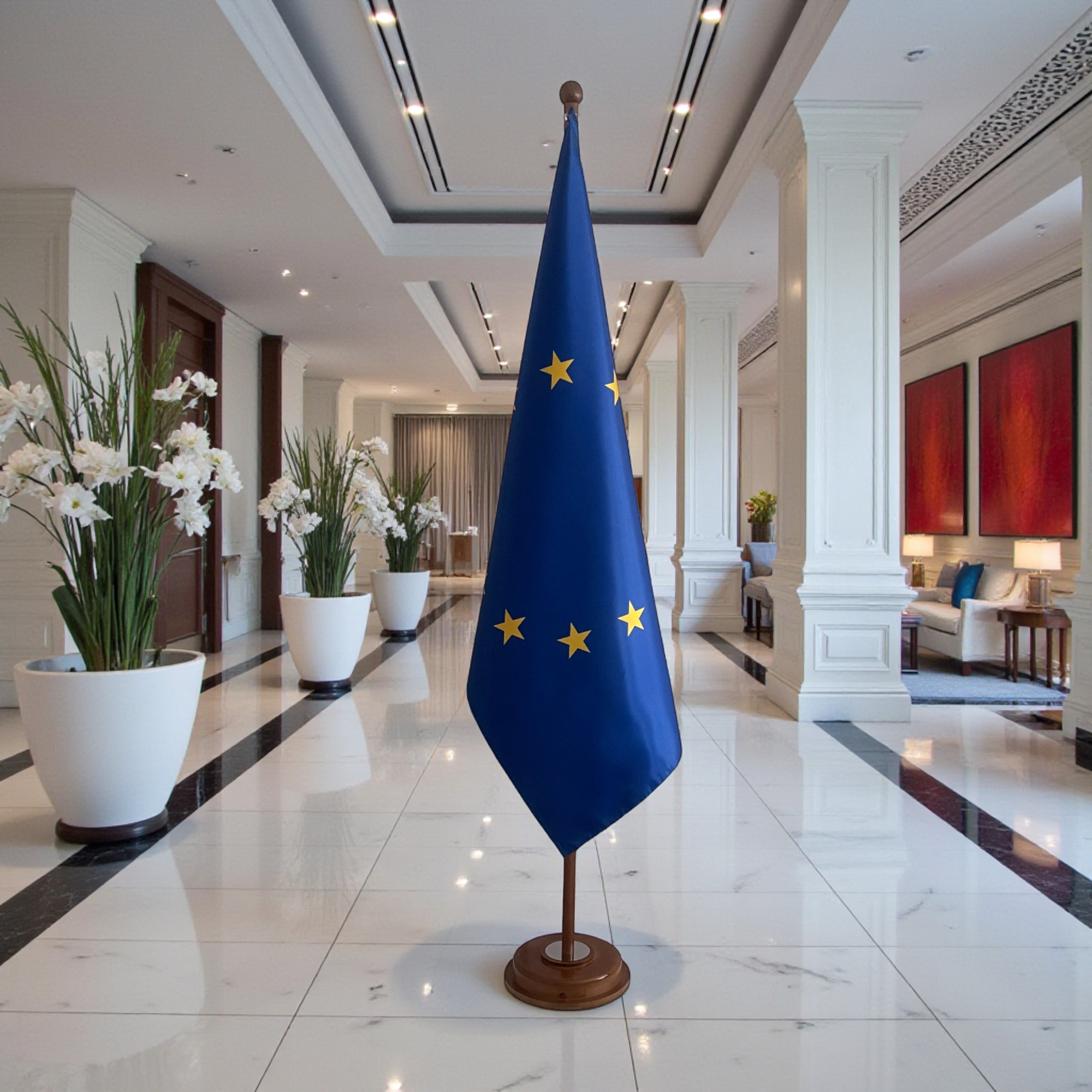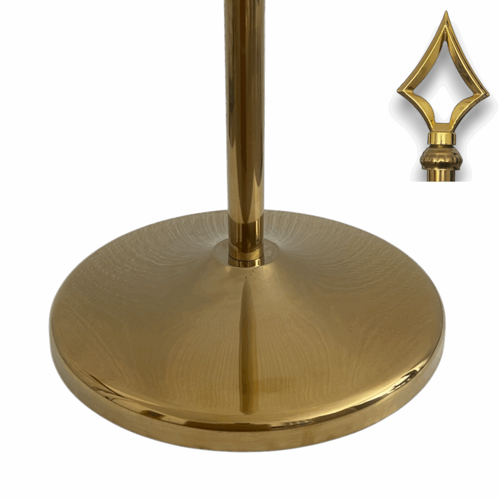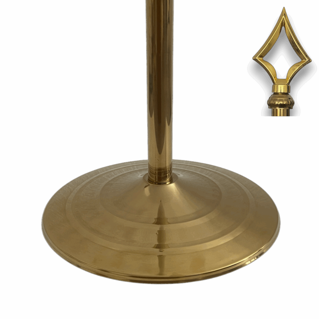 Suport cu lance si steagul UE, disponibile cu finisaj argintiu sau auriu, potrivite pentru utilizare la interior și în orice spațiu oficial. Lance solida, prevăzuta cu vârf ascutit sau tip bilă, care îmbină robustețea cu eleganța și pune în valoare drapelul într-un mod rafinat și profesional. Ideal pentru ambasade, consulate, săli de ședință, universități, birouri sau spații de recepție oficiale, acest soclu durabil asigură o prezentare prestigioasă în cadrul ceremoniilor, expozițiilor, reuniunilor importante sau evenimentelor oficiale.