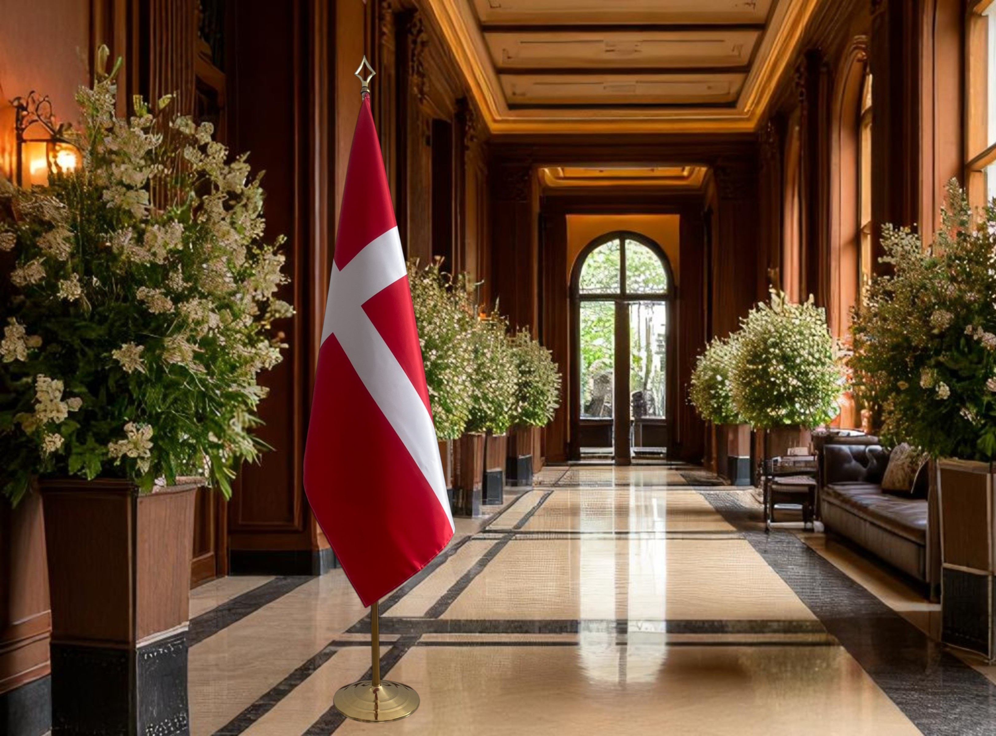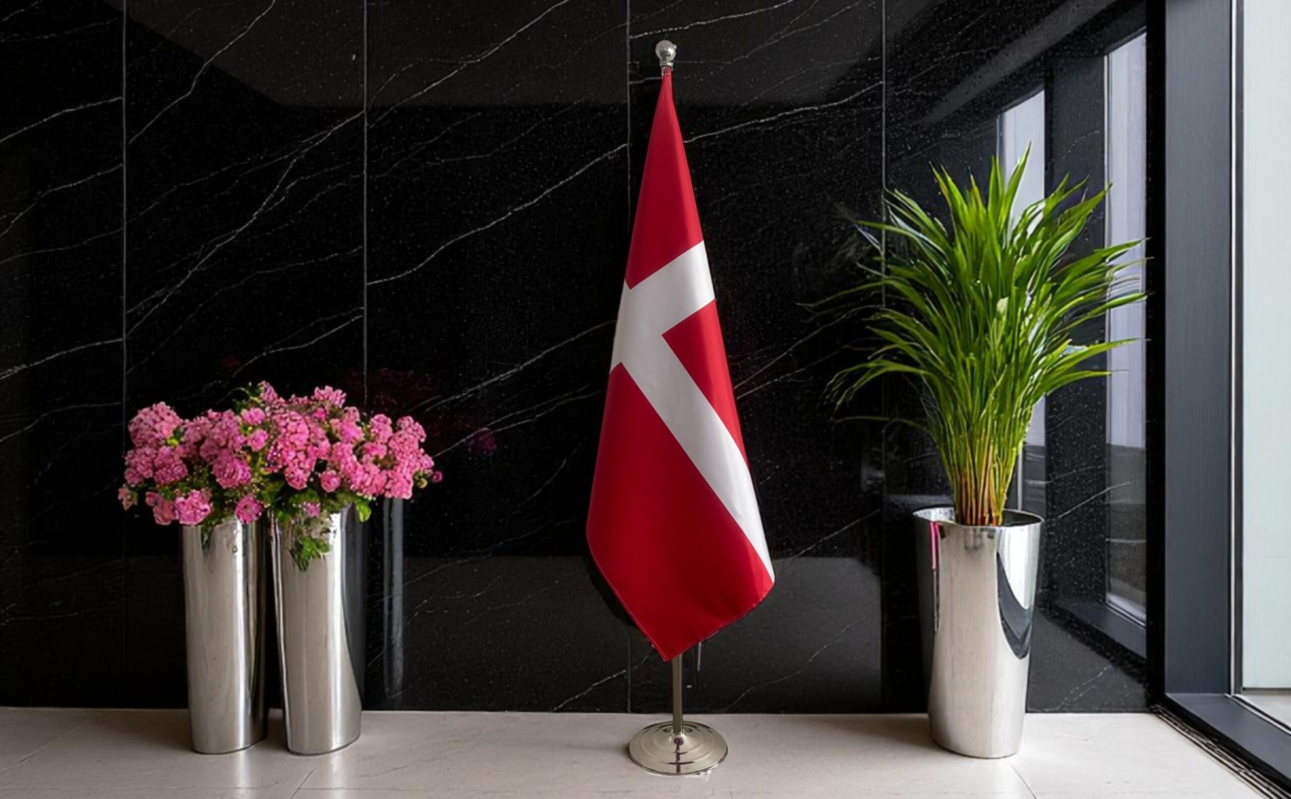 Suport cu lance si steag Danemarca, disponibile cu finisaj argintiu sau auriu, potrivite pentru utilizare la interior și în orice spațiu oficial. Lance solida, prevăzuta cu vârf ascutit sau tip bilă, care îmbină robustețea cu eleganța și pune în valoare drapelul într-un mod rafinat și profesional. Ideal pentru ambasade, consulate, săli de ședință, universități, birouri sau spații de recepție oficiale, acest soclu durabil asigură o prezentare prestigioasă în cadrul ceremoniilor, expozițiilor, reuniunilor importante sau evenimentelor oficiale.