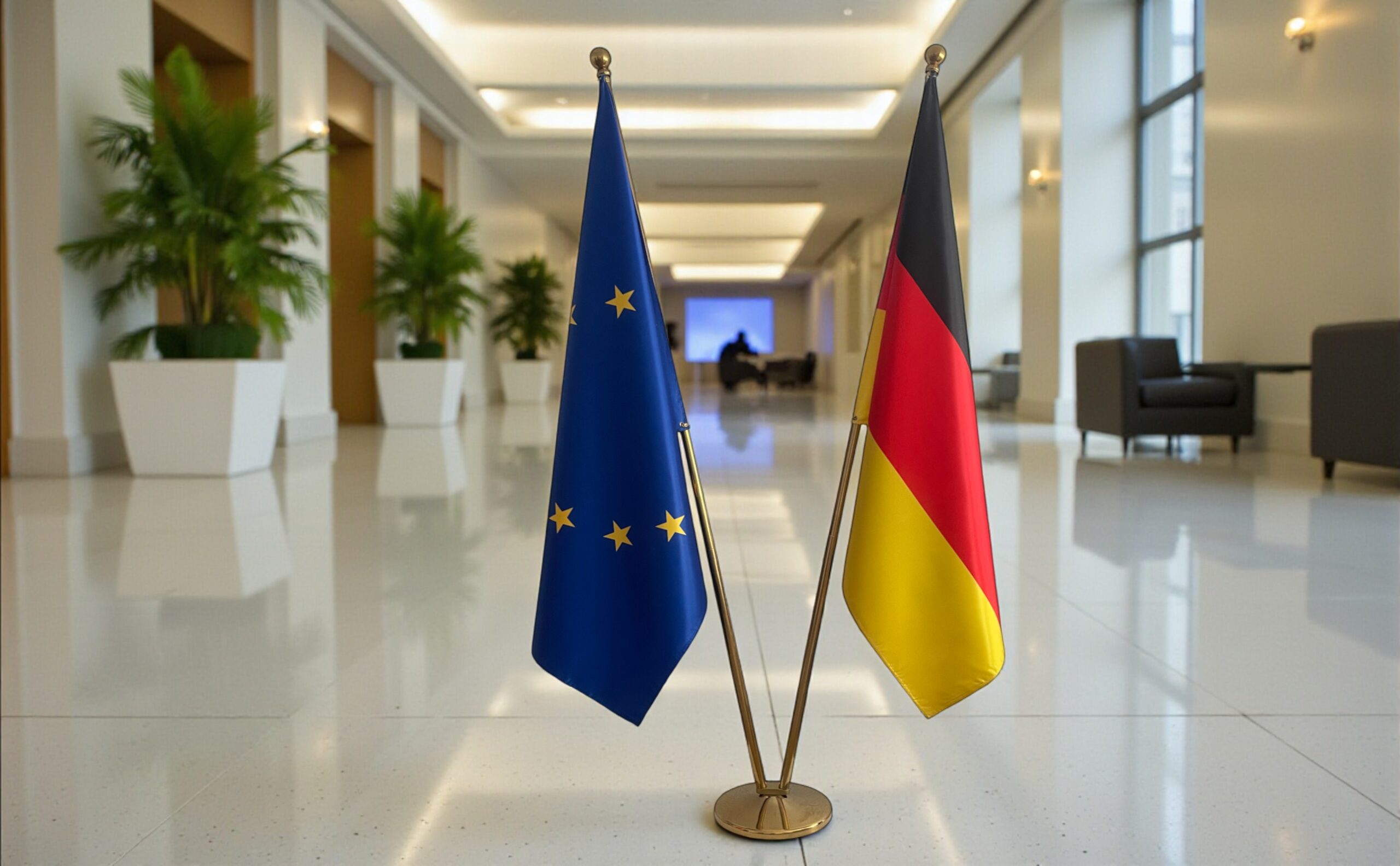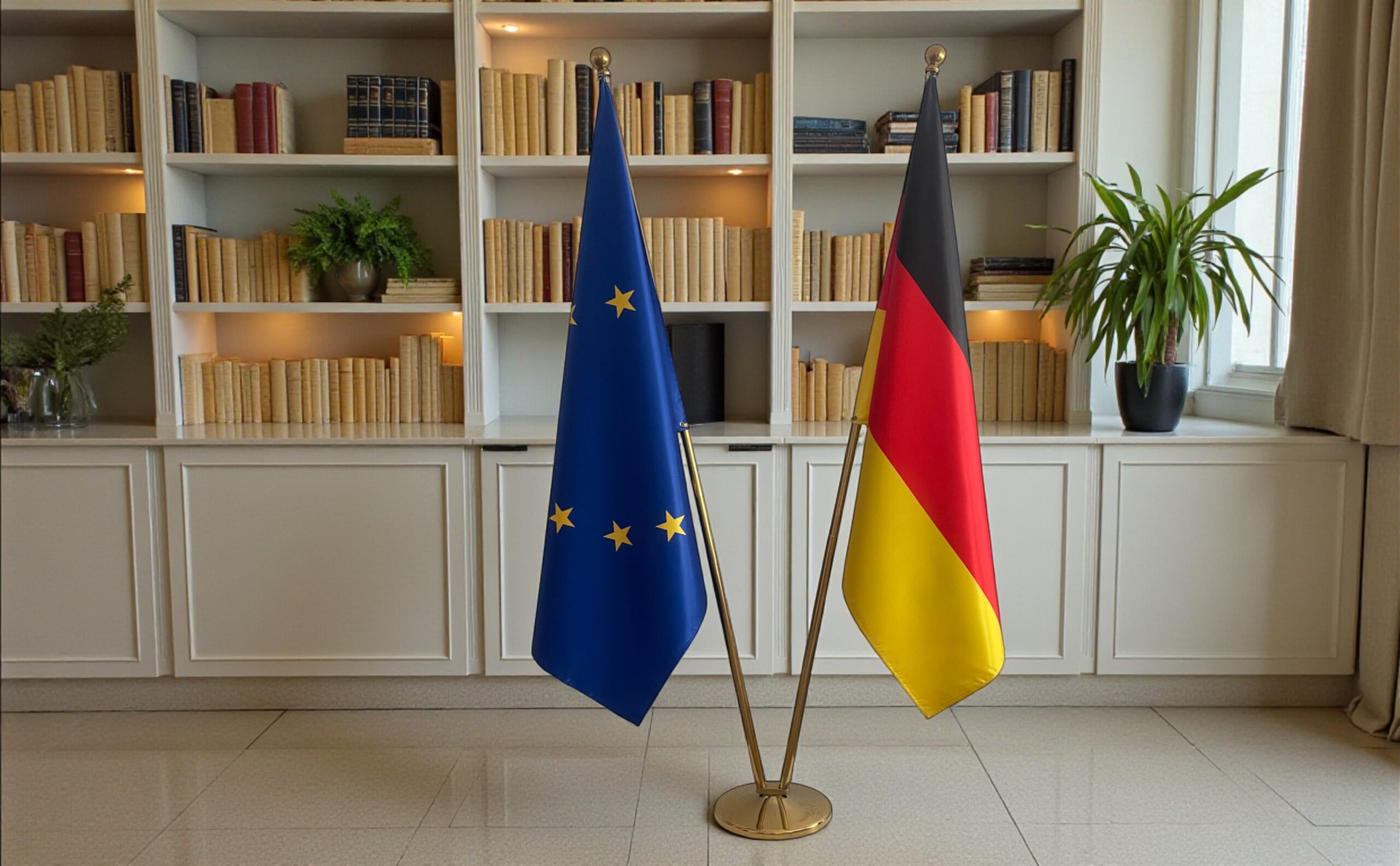 Suport cu lance si steagul Germaniei, disponibile cu finisaj argintiu sau auriu, potrivite pentru utilizare la interior și în orice spațiu oficial. Lance solida, prevăzuta cu vârf ascutit sau tip bilă, care îmbină robustețea cu eleganța și pune în valoare drapelul într-un mod rafinat și profesional. Ideal pentru ambasade, consulate, săli de ședință, universități, birouri sau spații de recepție oficiale, acest soclu durabil asigură o prezentare prestigioasă în cadrul ceremoniilor, expozițiilor, reuniunilor importante sau evenimentelor oficiale.