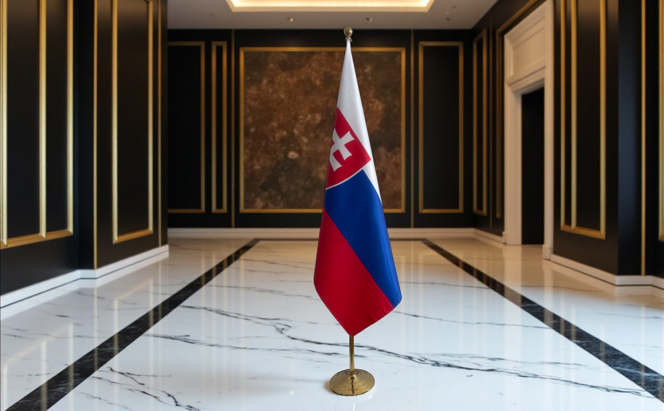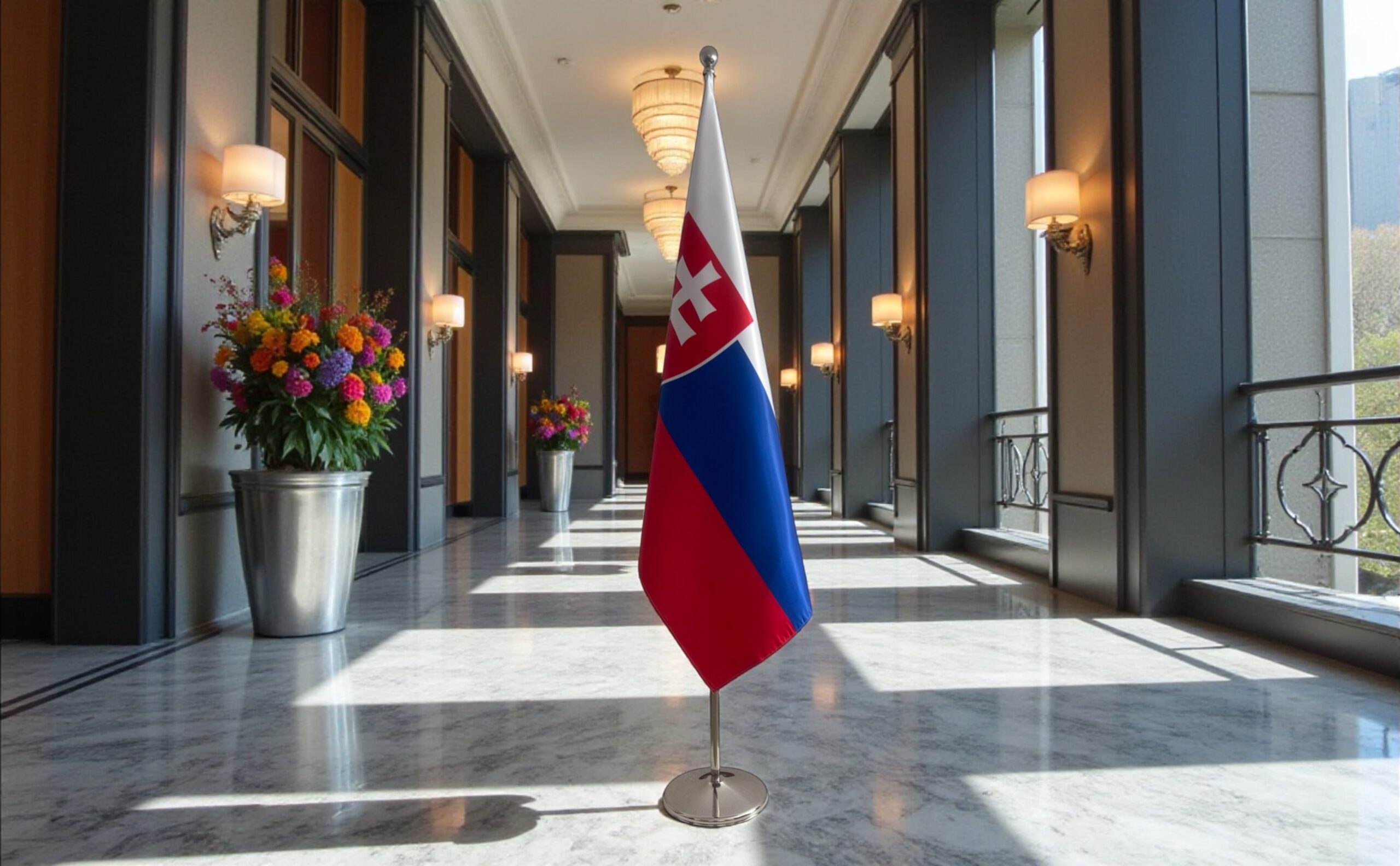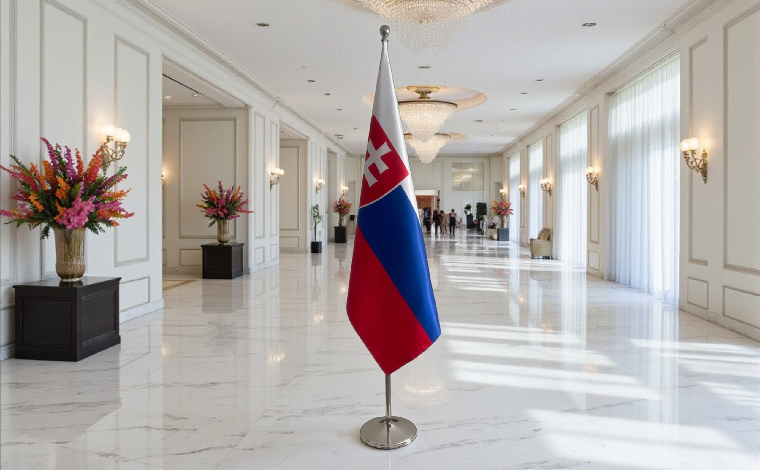 Suport cu lance si steagul Slovaciei, disponibile cu finisaj argintiu sau auriu, potrivite pentru utilizare la interior și în orice spațiu oficial. Lance solida, prevăzuta cu vârf ascutit sau tip bilă, care îmbină robustețea cu eleganța și pune în valoare drapelul într-un mod rafinat și profesional. Ideal pentru ambasade, consulate, săli de ședință, universități, birouri sau spații de recepție oficiale, acest soclu durabil asigură o prezentare prestigioasă în cadrul ceremoniilor, expozițiilor, reuniunilor importante sau evenimentelor oficiale.