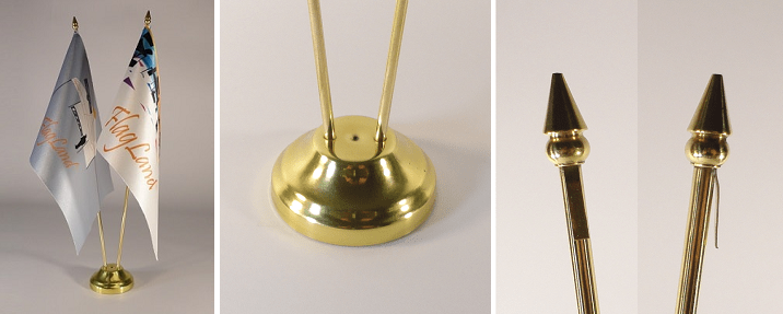Suport din alamă pentru două stegulețe. Imprimarea stegulețelor este personalizată cu sigla companiei dvs.,
